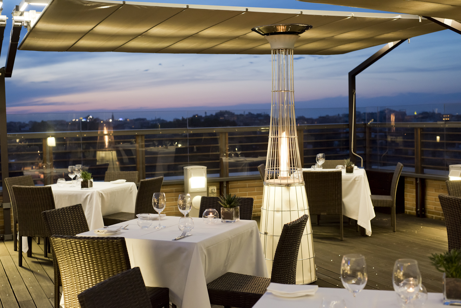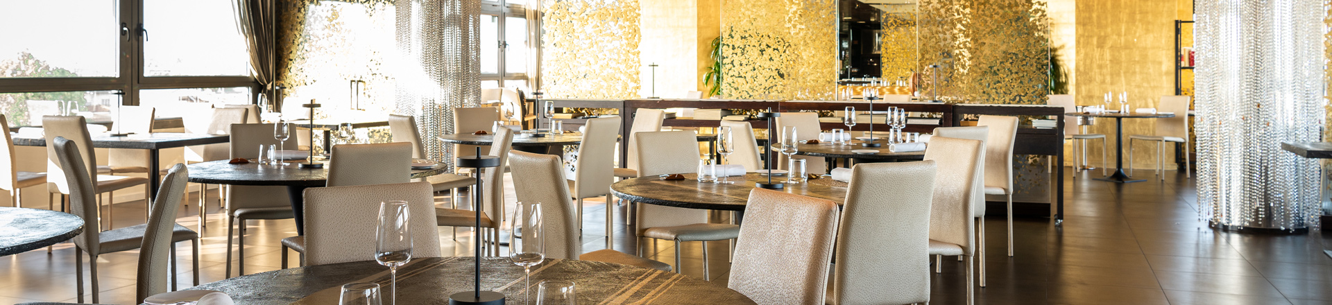 Elegante e accogliente, la sala è caratterizzata da ampie vetrate dalle quali si gode di un bel panorama su uno scorcio di città che di sera si arricchisce di luci romantiche e suggestive. Tavoli ampi, comode sedute, colori caldi e il tocco dei cristalli, sono perfetti elementi per godersi una serata di assoluto piacere.